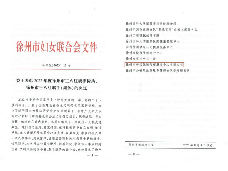 近日,徐州市婦女聯(lián)合會印發(fā)《關(guān)于表彰2022年度徐州市三八紅旗標(biāo)兵、徐州市三八紅旗手(集體)的決定》(徐婦發(fā)〔2023〕15號),徐州國投集團(tuán)所屬徐州市勞動保障代理服務(wù)中心有限公司(以下簡稱“勞代公司”)被授予“徐州市三八紅旗集體”榮譽(yù)稱號。