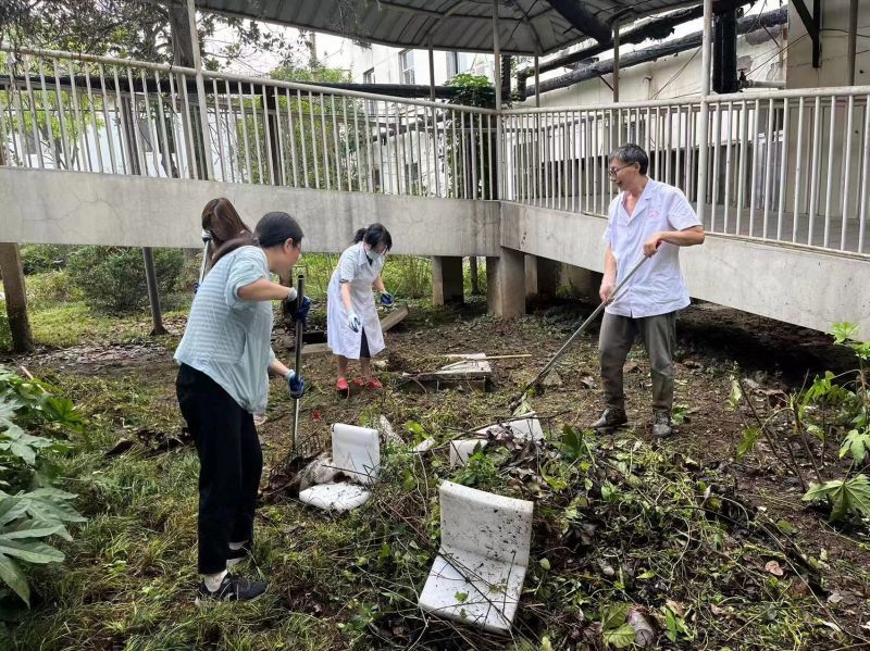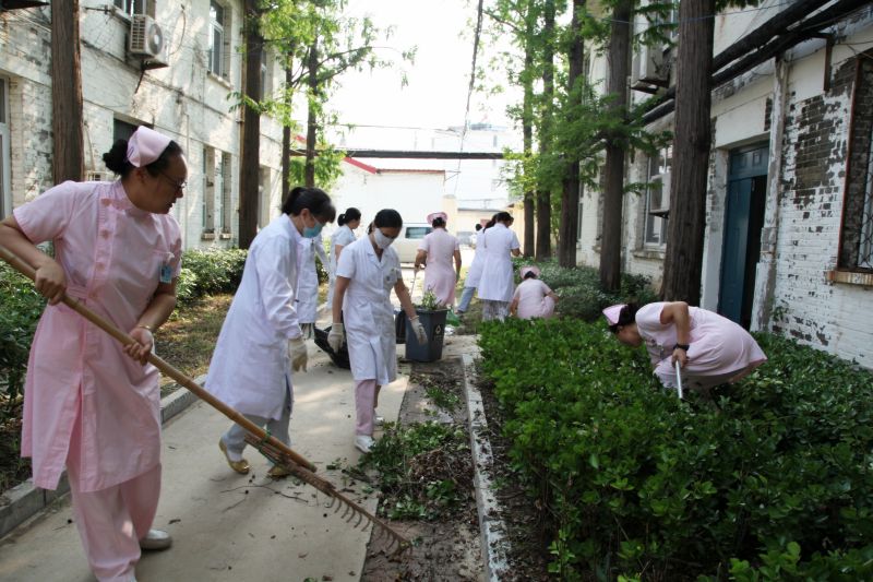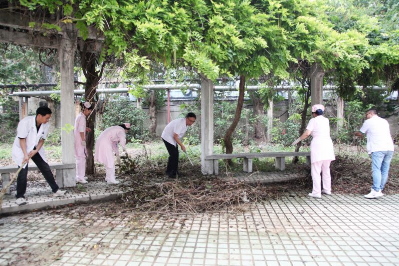 清潔活動實行包干到組。院內(nèi)各個綠化區(qū)分成26個區(qū)域,由全院各科室分為26個小組負責,每個小組設包干院領(lǐng)導和責任人。由于剛剛完成修剪工作,綠化區(qū)表面布滿了厚厚的樹枝及樹葉,加之連下幾天大雨,地面潮濕,腐爛的樹葉發(fā)出刺鼻的霉味,給清潔任務帶來了不便。