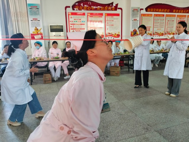 團(tuán)隊(duì)競(jìng)技,協(xié)作挑戰(zhàn)點(diǎn)燃熱情。活動(dòng)"紙杯接力"考驗(yàn)技巧與速度——隊(duì)員們用嘴將紙杯從繩子的一頭吹向另外一頭。場(chǎng)上選手全神貫注,使出了全身的力氣吹著紙杯,臉被憋得通紅。場(chǎng)下隊(duì)友加油聲此起彼伏,競(jìng)技與歡笑交織成熱烈畫卷;"齊頭并進(jìn)"環(huán)節(jié),每隊(duì)成員需頭對(duì)頭頂住一張A4紙、步調(diào)一致完成折返跑。隊(duì)員們互相商量著前進(jìn)的步伐和技巧,爭(zhēng)取自己以零失誤的默契配合率先沖線。有的隊(duì)伍跑著跑著紙掉了,有的交接時(shí)帽子碰掉了,各種狀況層出不窮,笑聲頻發(fā),加油聲此起彼伏;在“搶板凳”拼手速拼腦力環(huán)節(jié),隨著音樂(lè)聲響起,5人繞著板凳轉(zhuǎn)圈,有的小心地挪動(dòng)著步子,生怕音樂(lè)停止時(shí)錯(cuò)過(guò)了板凳,有的看似漫不經(jīng)心,實(shí)則心中有數(shù),音樂(lè)一停,大家趕緊搶板凳坐下。