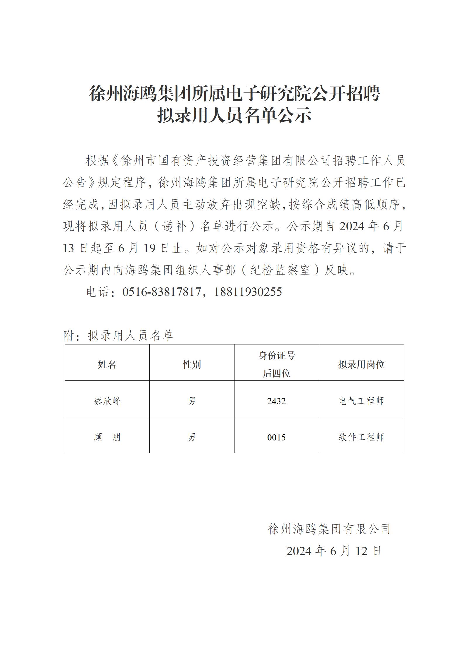 徐州海鷗集團所屬電子研究院公開招聘擬錄用人員名單公示