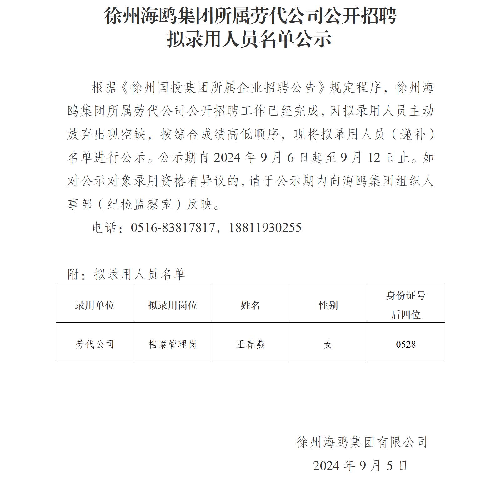 徐州海鷗集團所屬勞代公司公開招聘擬錄用人員名單公示