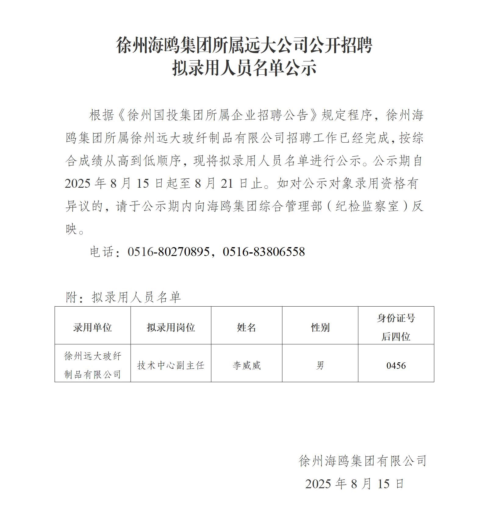 徐州海鷗集團(tuán)所屬遠(yuǎn)大公司公開(kāi)招聘擬錄用人員名單公示