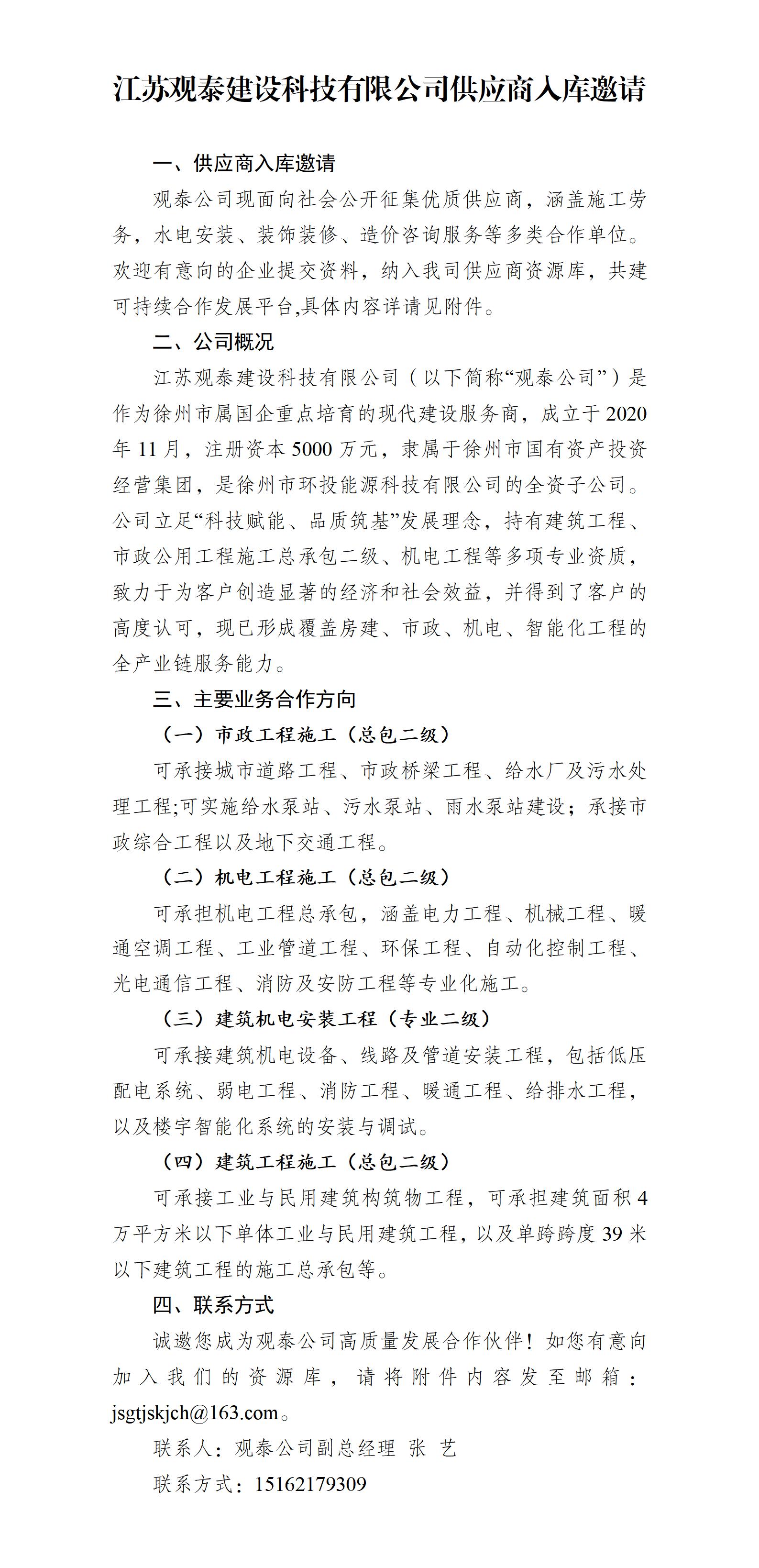 江蘇觀(guān)泰建設(shè)科技有限公司供應(yīng)商入庫(kù)邀請(qǐng)