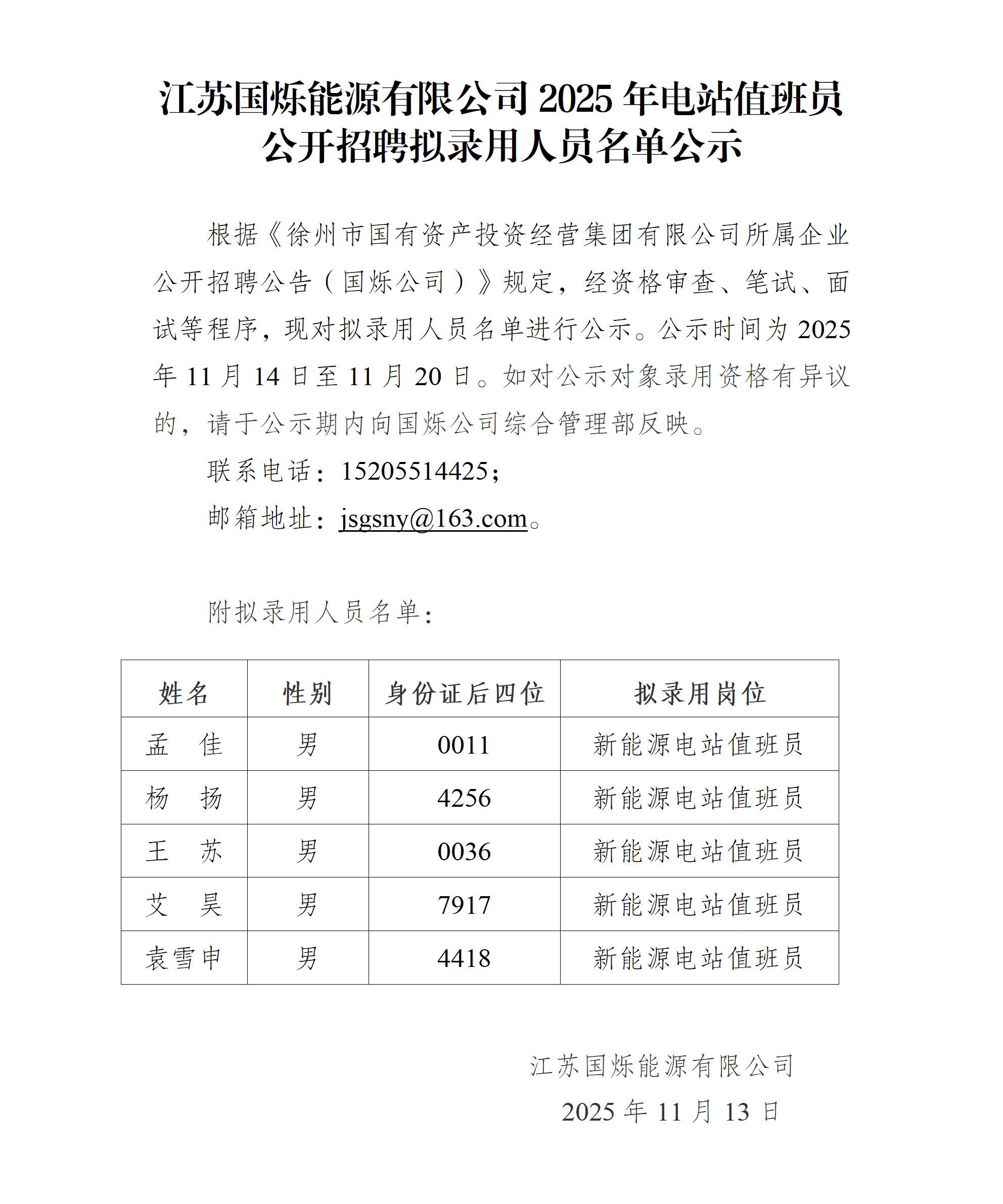 江蘇國(guó)爍能源有限公司2025年電站值班員公開(kāi)招聘擬錄用人員名單公示