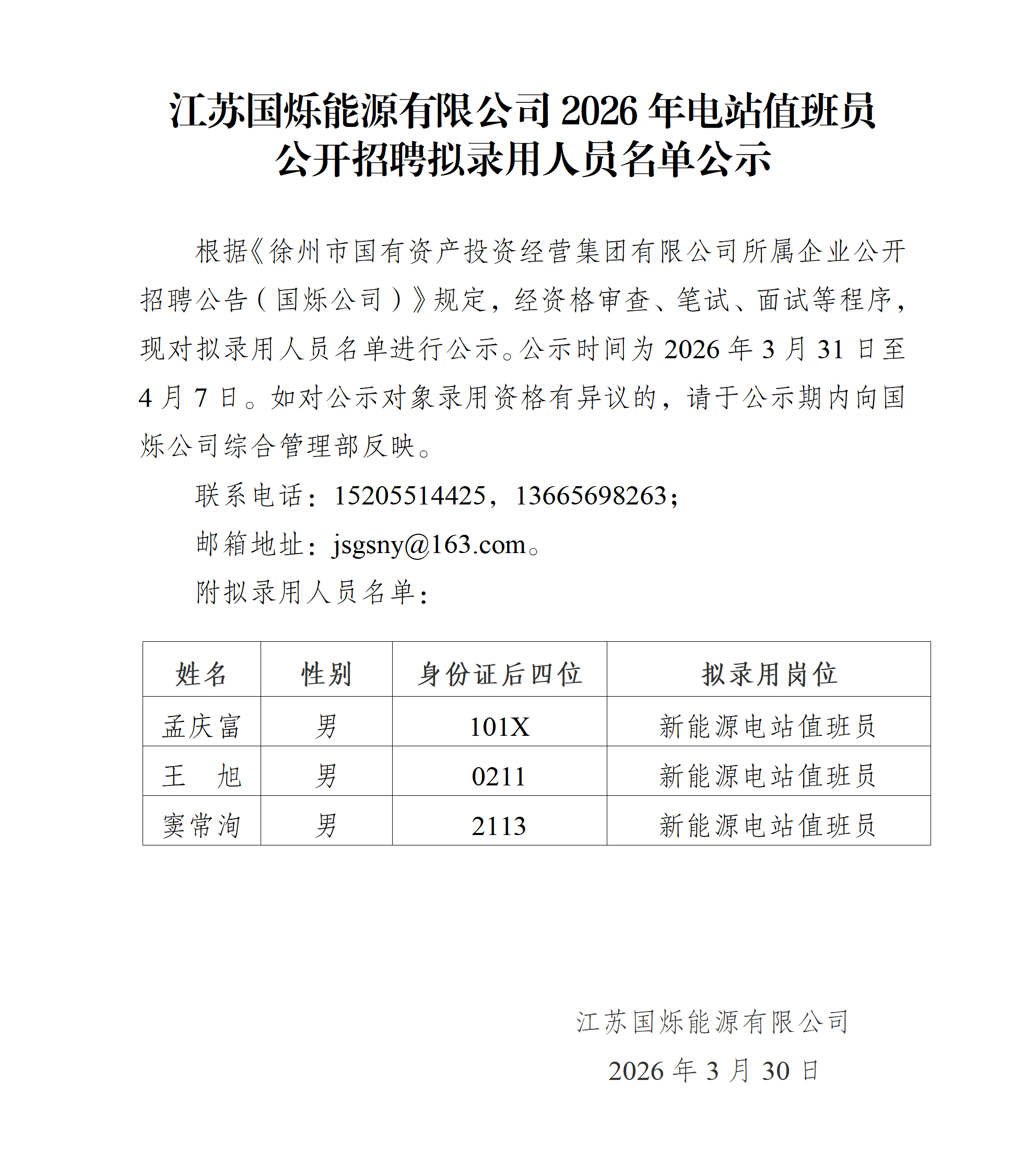 江蘇國爍能源有限公司2026年電站值班員公開招聘擬錄用人員名單公示