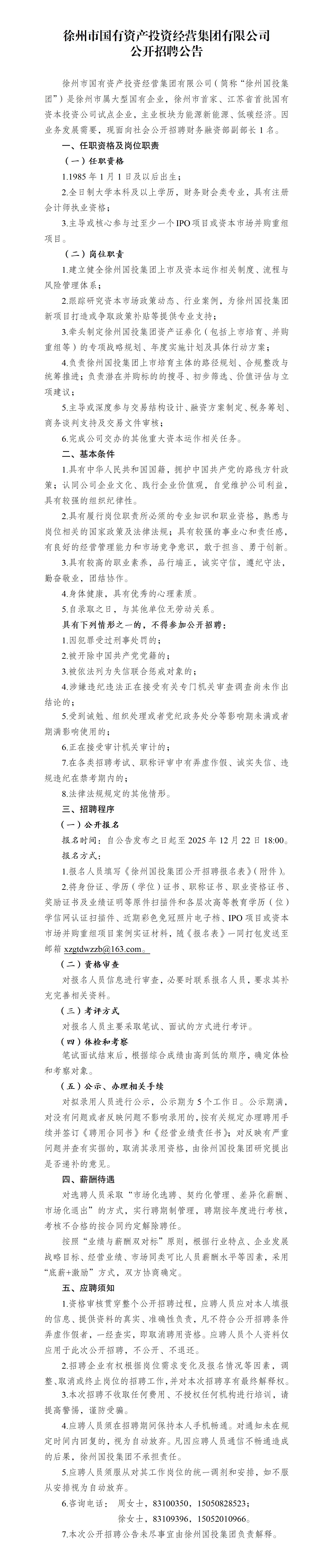 徐州市國(guó)有資產(chǎn)投資經(jīng)營(yíng)集團(tuán)有限公司公開(kāi)招聘公告