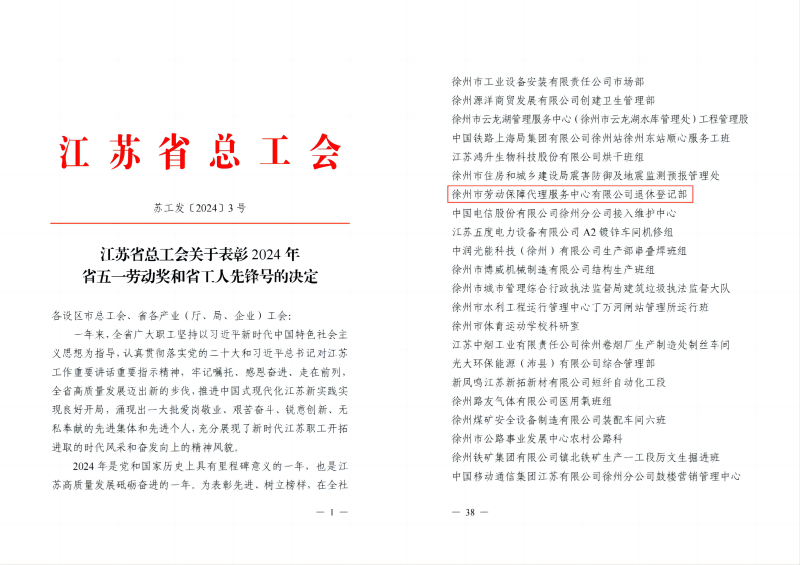 近日,江蘇省總工會(huì)下發(fā)《江蘇省總工會(huì)關(guān)于表彰2024年省五一勞動(dòng)獎(jiǎng)和省工人先鋒號(hào)的決定》(蘇工發(fā)〔2024〕3號(hào)),徐州國(guó)投集團(tuán)所屬徐州市勞動(dòng)保障代理服務(wù)中心有限公司退休登記部獲“江蘇省工人先鋒號(hào)”榮譽(yù)稱號(hào)。長(zhǎng)期以來(lái),勞代公司退休登記部作為窗口服務(wù)部門(mén),以創(chuàng)建人民滿…