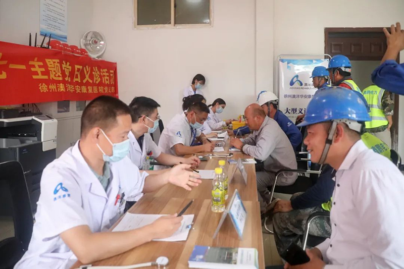 徐州澳洋華安康復(fù)醫(yī)院的醫(yī)務(wù)人員深入項目建設(shè)現(xiàn)場,為奮戰(zhàn)在建設(shè)一線的施工及管理人員開展義診活動。活動中,醫(yī)療專家和醫(yī)護(hù)團(tuán)隊細(xì)心嚴(yán)謹(jǐn)為每一位一線工人進(jìn)行血壓血糖檢測、用藥指導(dǎo)、身心健康問題解答等。本次義診活動現(xiàn)場氣氛和諧融洽,讓項目全體員工深切感受到了黨組織的溫暖和關(guān)懷。