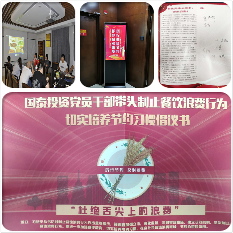 活動(dòng)首先由丁秀同志向大家宣讀國(guó)泰投資黨總支和機(jī)關(guān)黨支部發(fā)起的《國(guó)泰投資黨員干部帶頭制止餐飲浪費(fèi)行為切實(shí)培養(yǎng)節(jié)約習(xí)慣倡議書》,倡導(dǎo)大家尊重勞動(dòng),珍惜糧食,以黨員身份發(fā)揮模范帶頭作用,從自身做起,從節(jié)約一粒糧食做起,養(yǎng)成理性用餐,節(jié)約用餐的習(xí)慣。全體黨員還在倡議簽名簿上寫下自己的名字,做出鄭重承諾,發(fā)揮表率作用,做厲行節(jié)約、反對(duì)餐飲浪費(fèi)的踐行者、宣傳者和監(jiān)督者。隨后,全體黨員集中深入學(xué)習(xí)《習(xí)總書記對(duì)制止餐飲浪費(fèi)行為的重要指示精神》和集團(tuán)公司黨委《關(guān)于加強(qiáng)精神文明教育制止餐飲浪費(fèi)行為的通知》,觀看《新聞1+1》“觸目驚心”的餐飲浪費(fèi),如何治?和《焦點(diǎn)訪談》一粥一飯不易且重大的電視節(jié)目,大家思想上受到了教育,心靈上受到了觸動(dòng)。