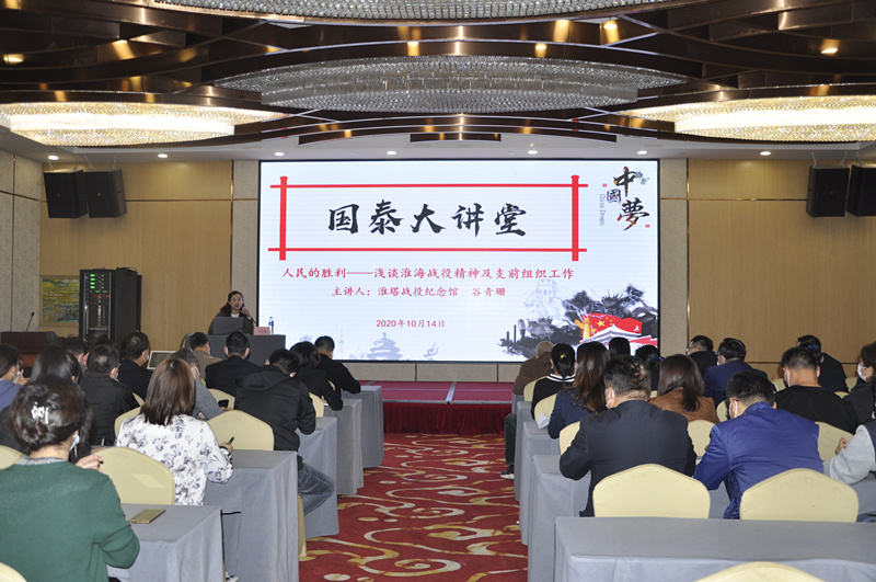 為持續(xù)深入開展習(xí)近平新時(shí)代中國(guó)特色社會(huì)主義思想學(xué)習(xí)教育,全面落實(shí)《國(guó)泰投資公司建設(shè)學(xué)習(xí)型企業(yè)實(shí)施方案》文件精神,培養(yǎng)企業(yè)核心競(jìng)爭(zhēng)力,促進(jìn)國(guó)泰投資公司轉(zhuǎn)型發(fā)展。近日,國(guó)泰投資開展“國(guó)泰大講堂”活動(dòng),第一期由機(jī)關(guān)黨支部承辦,特邀淮海戰(zhàn)役紀(jì)念館谷青珊老師授課。國(guó)泰投資本部全體干部職工,各所屬全資、控股公司中層及以上干部參加活動(dòng)。