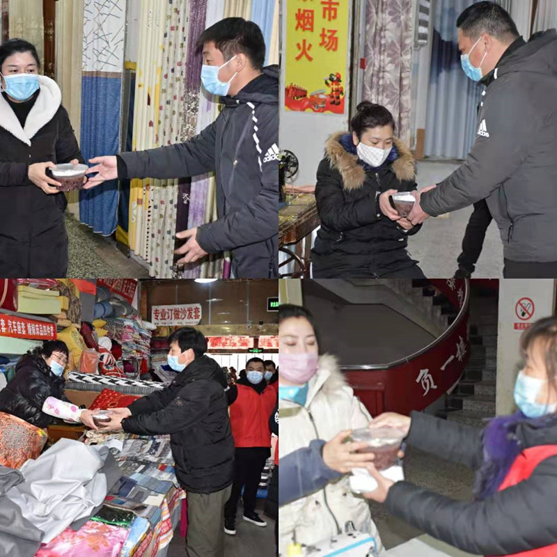 “過了臘八就是年”。今年臘八節(jié)恰逢大寒節(jié)氣,早上6點(diǎn),工作人員便早早來到市場,將提前準(zhǔn)備好的優(yōu)質(zhì)糯米、黑米、花生米、蕓豆、紅豆、葡萄干、紅棗等食材清洗干凈,經(jīng)過近5個(gè)小時(shí)的熬制,一碗碗熱氣騰騰、濃郁糯香的臘八粥終于完成。因疫情原因,今年取粥的形式從以往排隊(duì)領(lǐng)取轉(zhuǎn)變?yōu)橛晒ぷ魅藛T逐層逐戶送到商戶手中,送的是粥暖的是心,商戶們喝著甜蜜的臘八粥,臉上洋溢著開心的笑容。