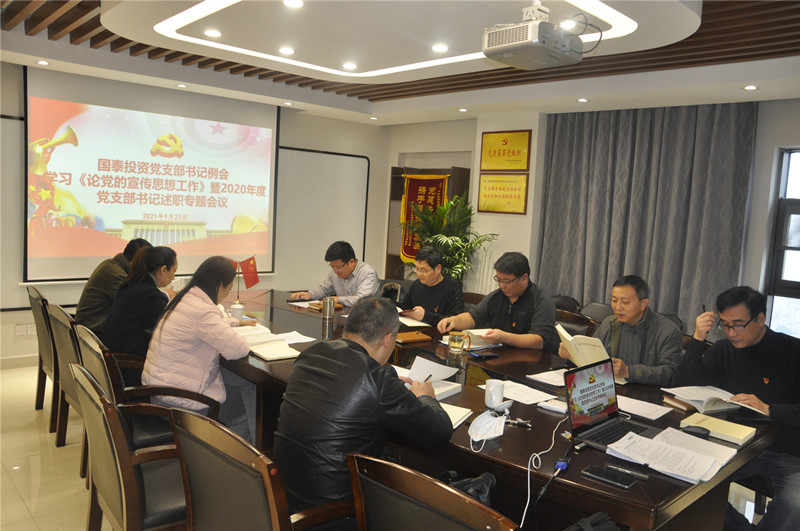 為學(xué)習(xí)貫徹習(xí)近平總書記關(guān)于宣傳思想工作的新思想、新觀點、新論斷,進一步落實黨建工作責(zé)任制,推動全面從嚴(yán)治黨向基層延伸。1月21日上午,根據(jù)集團公司“雙述雙評”工作安排,國泰投資黨總支召開學(xué)習(xí)貫徹《論黨的宣傳思想工作》暨2020年度黨支部書記述職專題會議。會議由國泰投資黨總支書記霍凱主持,黨總支中心組成員、各直屬黨支部書記參加。