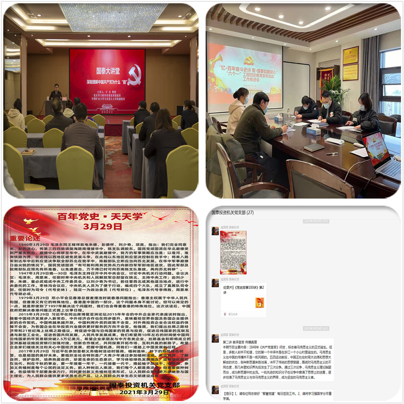 二是強(qiáng)化領(lǐng)會(huì)精神,筑牢思想理論基礎(chǔ)。國泰投資組織全體黨員集中學(xué)習(xí)習(xí)近平總書記在黨史學(xué)習(xí)教育動(dòng)員大會(huì)上的重要講話精神,把黨史學(xué)習(xí)教育納入黨總支理論中心組、黨支部和黨員個(gè)人年度學(xué)習(xí)計(jì)劃,為黨員購買“四史”書籍,開展讀一本黨史書學(xué)習(xí)交流活動(dòng)。通過豐富的歷史文獻(xiàn)和著作,讓全體黨員對(duì)黨帶領(lǐng)人民不懈奮斗的光輝歷程,黨的思想理論創(chuàng)立、發(fā)展和完善的歷史進(jìn)程進(jìn)行全面學(xué)習(xí)了解,不斷深化黨史學(xué)習(xí)教育成效。