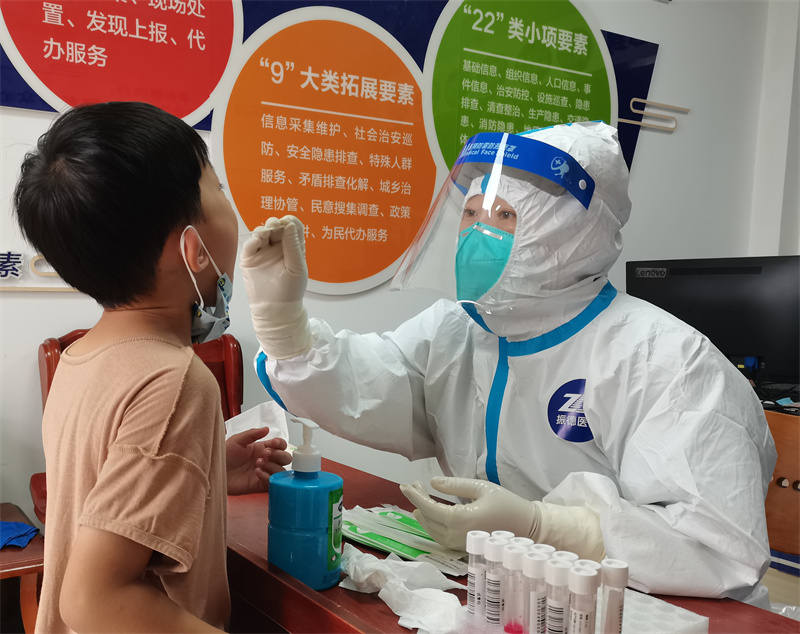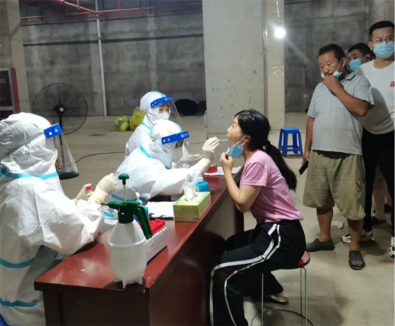 條件的簡陋,為采樣工作增加了難度。在炎熱的環(huán)境下,她們穿著密不透風(fēng)的防護(hù)服,帶著N95口罩、面屏和多層手套,不停地為持續(xù)不斷到來的居民進(jìn)行采樣。大到90多歲的老人,小到幾個(gè)月的嬰兒,一直戰(zhàn)斗到晚上11點(diǎn)多,在8個(gè)小時(shí)的時(shí)間里,憑著她們麻利地操作和熟練的技術(shù),共為4000人完成了核酸采樣。采樣結(jié)束后,有的姐妹累得撐不住了,脫了防護(hù)服,顧不得雨天地面的潮濕,直接躺在了生硬的水泥地上。