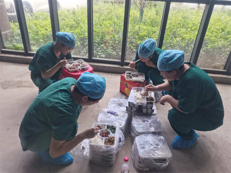 8月1日,在35℃的高溫下,需要入戶為行動(dòng)不便、分散在各個(gè)村莊的居民進(jìn)行采樣,鄉(xiāng)間道路狹窄,無法車接車送,只能步行前往。穿著多層的防護(hù)服,在烈日下奔波,悶熱的程度難以想象。有的姐妹恰巧處于特殊生理期,悶熱加上勞累,身體幾乎要虛脫了,仍然堅(jiān)強(qiáng)地奮戰(zhàn)在前面,堅(jiān)決不退場,圓滿完成了采樣任務(wù)。由于穿著防護(hù)服,每次至少要連續(xù)工作4個(gè)小時(shí)以上,為了避免上廁所的麻煩,她們不敢喝水,在炎熱的天氣里只能忍受著饑渴。