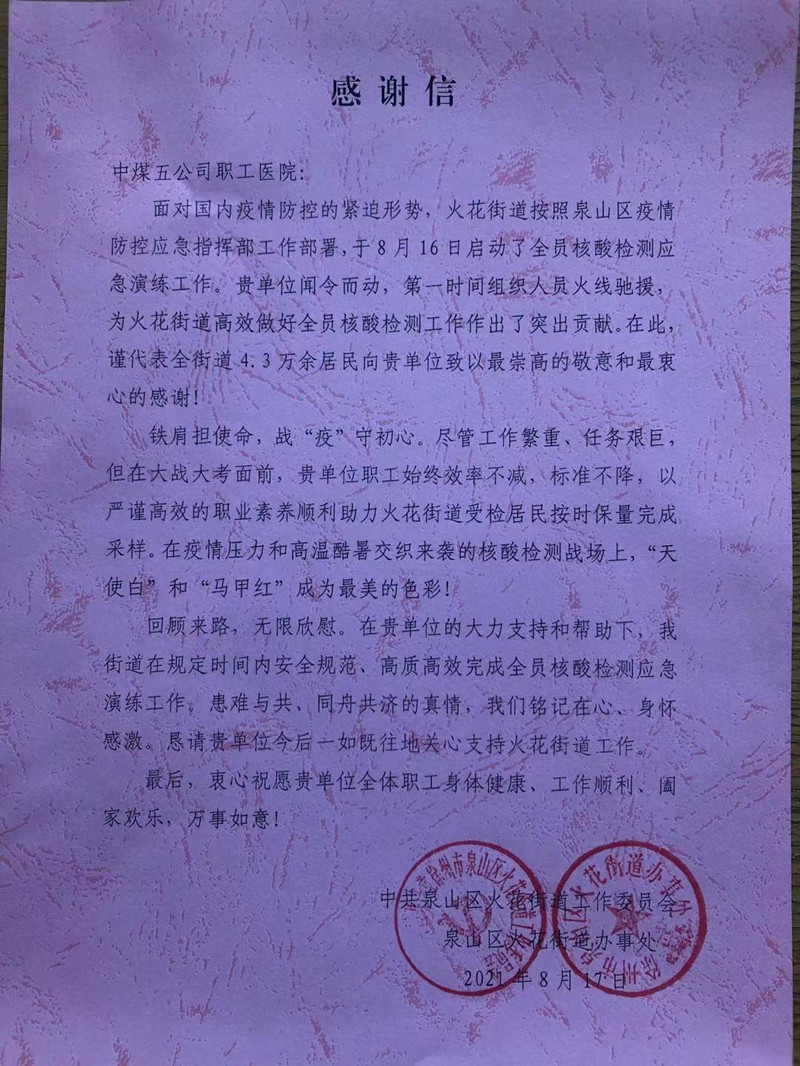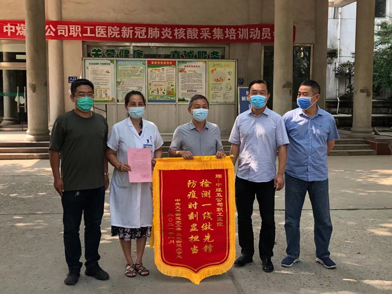 8月19日上午,泉山區(qū)火花辦事處領(lǐng)導(dǎo)一行來(lái)到中煤五公司職工醫(yī)院,并送上感謝信和錦旗,表示“在中煤五公司職工醫(yī)院的大力支持和幫助下,街道在規(guī)定時(shí)間內(nèi)安全規(guī)范、高質(zhì)高效完成全員核酸檢測(cè)應(yīng)急演練工作?;茧y與共、同舟共濟(jì)得 真情我們銘記在心、身懷感激”。院黨委書記宋俊祥代表全院參戰(zhàn)職工接受感謝信和錦旗,并表示今后將一如既往支持街道辦事處工作,共同戰(zhàn)役、共擔(dān)使命。
