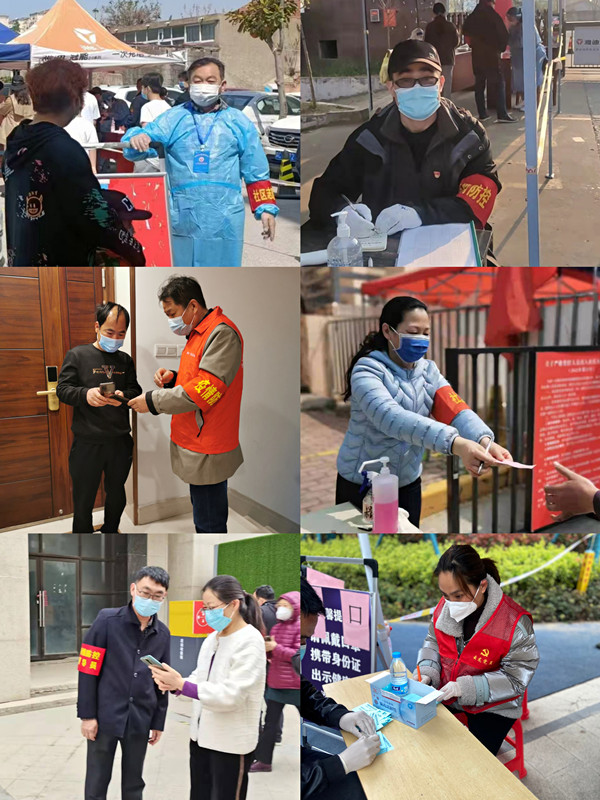 機(jī)關(guān)一支部書(shū)記陳杰帶領(lǐng)妻子和女兒一家三口齊上陣,全部都當(dāng)上抗疫志愿者;遠(yuǎn)大支部書(shū)記趙明芳既在北望小區(qū)廣場(chǎng)核酸檢測(cè)點(diǎn)協(xié)助做好體溫測(cè)量等工作,又兼顧做好“疫”后公司復(fù)工復(fù)產(chǎn)的工作部署;勞代支部副書(shū)記朱文華堅(jiān)守在徐州人家小區(qū)南門(mén),當(dāng)好小區(qū)“守門(mén)員”;新亞支部書(shū)記陳航除每日做好最新通知傳達(dá)、工作安排以外,返徐家人“3+11”健康監(jiān)測(cè)期滿(mǎn)后,他就報(bào)名參加了山語(yǔ)世家核酸檢測(cè)點(diǎn)查驗(yàn)兩碼等工作;正大支部書(shū)記王艷在世茂天域華府檢測(cè)點(diǎn)認(rèn)真開(kāi)具核酸檢測(cè)證明。