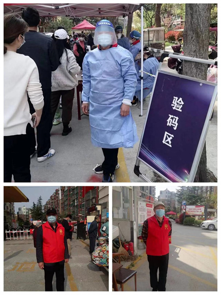 疫情當(dāng)前,責(zé)任在肩。作為酒店的一名老員工,六十多歲的李星宇在得知徐州疫情嚴(yán)重,主動(dòng)投入到社區(qū)防疫工作當(dāng)中,“我的兒子兒媳作為醫(yī)生舍小家為大家,奮戰(zhàn)在疫情第一線,深深地感動(dòng)了我。受孩子們的影響,我也加入了社區(qū)的志愿者隊(duì)伍。作為一名老員工,我要盡微薄之力,把關(guān)懷和愛(ài)心帶給社區(qū)居民,為社區(qū)服務(wù)責(zé)無(wú)旁貸?!崩钚怯蠲刻旆e極配合社區(qū)工作人員,一直忙忙碌碌,有時(shí)連水都顧不上喝一口,在社區(qū)門(mén)口搭棚,抬桌子,拉界線,做消毒,粘貼一米界線等工作,為居民做核酸做好準(zhǔn)備。社區(qū)通知7號(hào)早上5點(diǎn)要上崗到位,把小區(qū)外面的棚子拆除搬到小區(qū)里面,再重新搭好,在六點(diǎn)半之前要準(zhǔn)備好檢測(cè)核酸的一切工作,盡管工作繁重,他沒(méi)喊過(guò)一聲苦,沒(méi)叫過(guò)一聲累。
