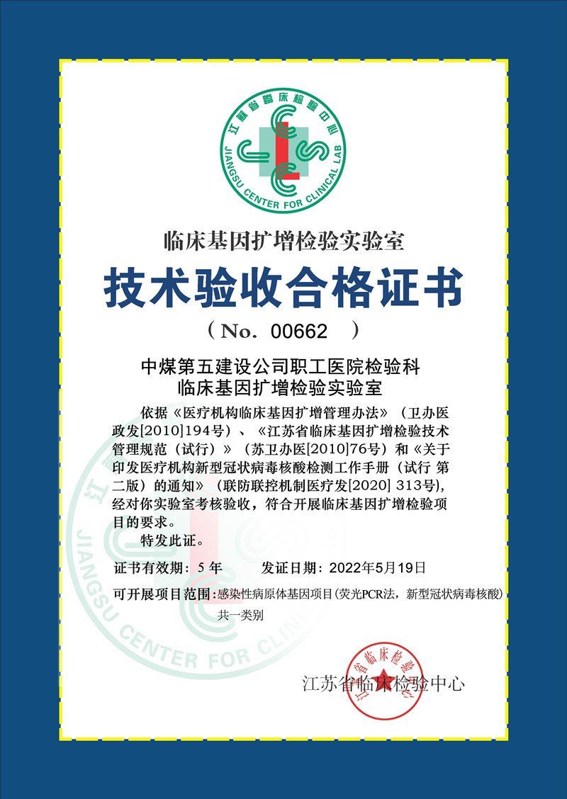 5月19日江蘇省臨床檢驗中心頒發(fā)了《中煤第五建設公司職工醫(yī)院檢驗科臨床基因擴增檢驗實驗室技術(shù)驗收合格證書》(NO 00662)。中煤五建職工醫(yī)院將以此為契機,抓住機遇,創(chuàng)新發(fā)展,圍繞“完善質(zhì)控體系、提升醫(yī)療質(zhì)量、加強學科建設”的目標,全方位做好醫(yī)院各項工作,實現(xiàn)醫(yī)院發(fā)展再邁一個新臺階。