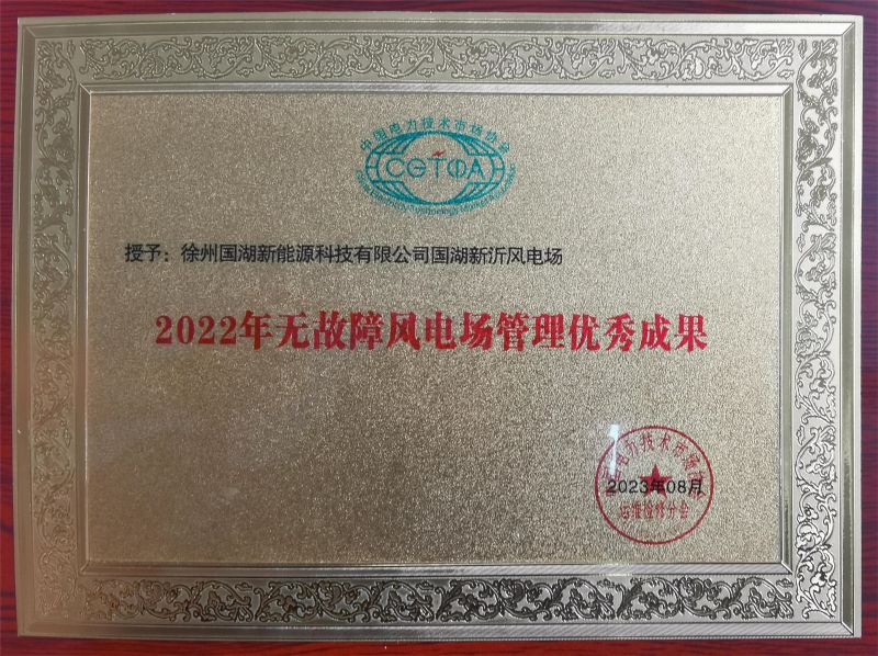 8月24日,徐州國湖新能源科技有限公司所屬國湖新沂風(fēng)電場(chǎng)榮獲中國電力技術(shù)市場(chǎng)協(xié)會(huì)頒發(fā)的“2022年無故障風(fēng)電場(chǎng)管理優(yōu)秀成果”獎(jiǎng)項(xiàng)。