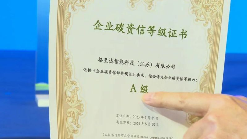 12月8日,在江蘇省新型能源體系示范啟動暨徐州市綠色低碳能源產(chǎn)業(yè)發(fā)展推進大會上,江蘇銀行徐州分行、格雷博智能動力、徐州國投集團共同簽署了格至達綠色貸款項目,簽署完走下臺的格至達智能科技(江蘇)有限公司副總經(jīng)理鄧昇,迫不及待地向記者展示了全市首張企業(yè)碳資信等級證書,“0001A”號!