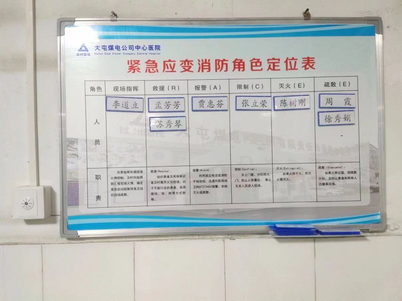 為明確各級崗位人員火災(zāi)救援分工職責,建立火災(zāi)快速響應(yīng)機制,大屯公司中心醫(yī)院在學習總結(jié)先進工作經(jīng)驗的基礎(chǔ)上,結(jié)合實際情況,設(shè)立了“科室火災(zāi)角色定位分工展示牌”,以明確在班職工的消防角色定位,提高職工的消防滅火和應(yīng)急疏散能力。