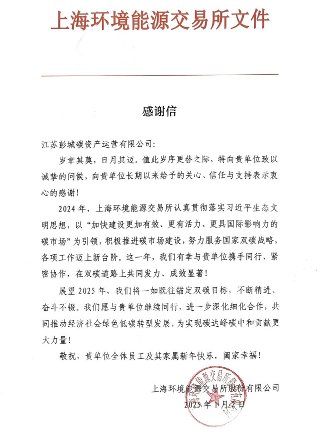 近日,彭城碳資產(chǎn)公司收獲了來(lái)自上海環(huán)境能源交易所(簡(jiǎn)稱“上海環(huán)交所”)的一封感謝信。信中表示,對(duì)彭城碳資產(chǎn)公司積極推進(jìn)碳市場(chǎng)建設(shè)表示肯定,未來(lái)將繼續(xù)同行、細(xì)化合作。