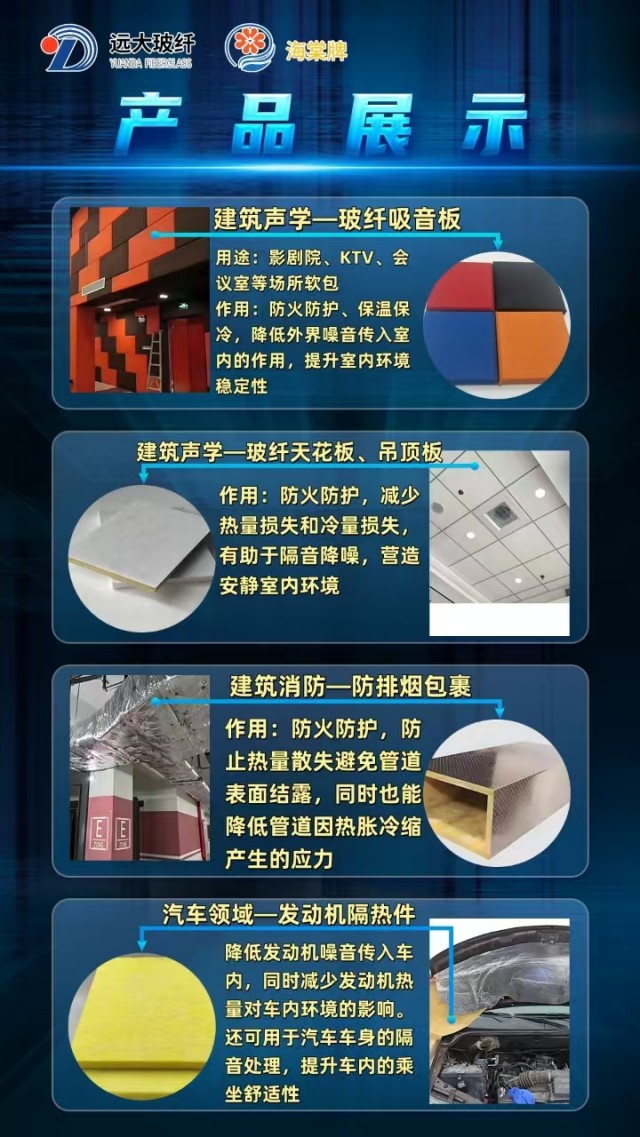 玻璃棉、玻璃棉板、玻璃棉卷氈、高溫玻璃棉卷氈、帶鋁箔玻璃棉板、帶鋁箔玻璃棉卷氈、汽車內(nèi)飾專用玻璃棉、樓地面隔聲板、無甲醛棕色玻璃棉(板)、無甲醛白色玻璃棉(板)、防排煙道專用包裹材料等、防排煙風(fēng)管、玻璃棉管殼。