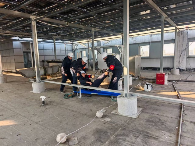 演練緊扣“安全第一、預防為主、綜合治理”方針,模擬電站運維人員在屋頂進行逆變器檢修時,不慎觸及裸露電纜導致觸電昏迷的緊急場景?;顒蝇F(xiàn)場,隨著總指揮一聲令下,演練正式拉開序幕。參演人員迅速進入角色,從事故發(fā)現(xiàn)、電源切斷、脫離電源、現(xiàn)場救護到啟動心肺復蘇、撥打急救電話,整個流程緊張有序、銜接緊密?,F(xiàn)場救援人員反應迅速、操作規(guī)范,充分展現(xiàn)了扎實的安全技能和高效的團隊協(xié)作能力。