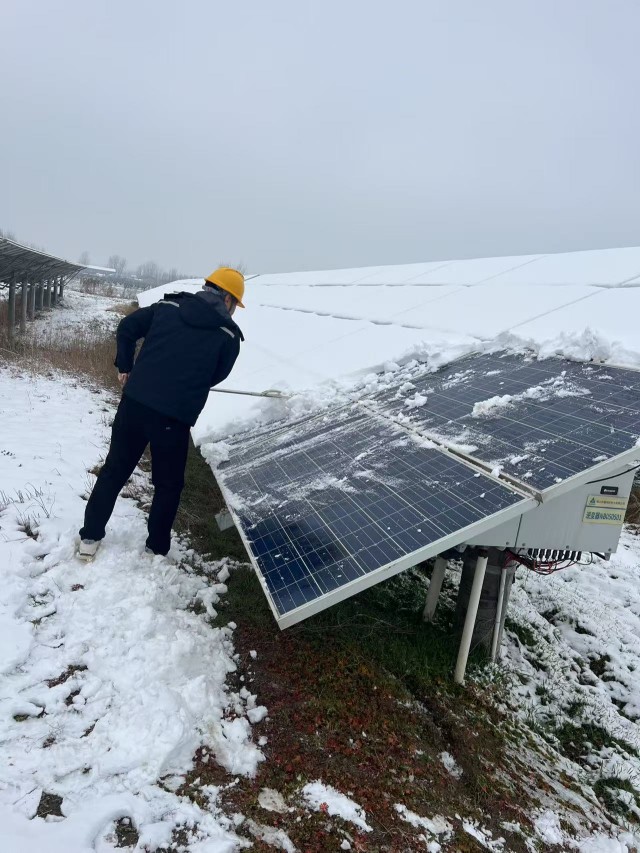 銀裝素裹的雪景下,是迫在眉睫的生產(chǎn)危機。電站迅速啟動應(yīng)急預(yù)案,運維團隊聞令而動,頂風(fēng)冒雪奔赴現(xiàn)場。凜冽寒風(fēng)中,員工們手持專用除雪工具,彎腰弓背細致清理光伏板積雪,既確保積雪清除徹底,又嚴防組件受損,凍紅的雙手與結(jié)霜的安全帽成為雪地里最動人的風(fēng)景。