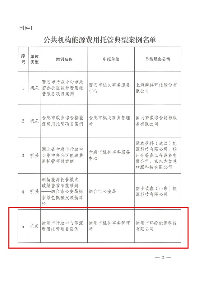 近日,國管局辦公室、國家發(fā)展改革委辦公廳、財政部辦公廳聯(lián)合發(fā)文,發(fā)布全國公共機(jī)構(gòu)能源費(fèi)用托管30個典型案例和25個入圍案例名單,徐州市環(huán)投能源科技有限公司(簡稱“環(huán)投公司”)托管服務(wù)的《徐州市行政中心能源費(fèi)用托管項(xiàng)目》被評定為典型案例。