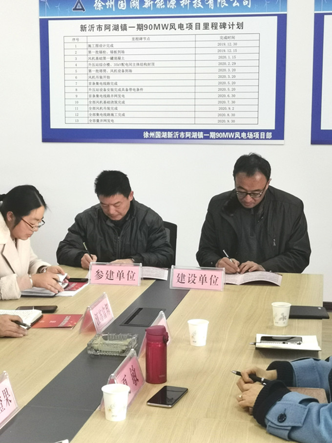 為進(jìn)一步嚴(yán)格貫徹落實集團公司黨委工程建設(shè)廉潔從業(yè)決策部署,有效從源頭預(yù)防各類違規(guī)違紀(jì)違法行為發(fā)生,為新沂市阿湖鎮(zhèn)一期90MW風(fēng)電項目工程建設(shè)、項目管理營造良好的廉潔環(huán)境。12月3日下午,國投環(huán)能公司全資企業(yè)徐州國湖新能源科技有限公司(以下簡稱“國湖公司”)在新沂市阿湖鎮(zhèn)便民服務(wù)中心舉行了《工程建設(shè)廉潔從業(yè)責(zé)任書》簽字儀式。國投環(huán)能公司黨總支書記、國湖公司董事長孫雷,國投環(huán)能公司紀(jì)檢聯(lián)系人,國湖公司風(fēng)電項目部代表及工程總承包、項目監(jiān)理、跟蹤審計等參建單位代表參加了儀式,簽字儀式由國投環(huán)能公司總經(jīng)理助理、國湖公司總經(jīng)理余躍主持。集團公司紀(jì)檢監(jiān)察室副主任夏敏到場見證簽訂儀式。