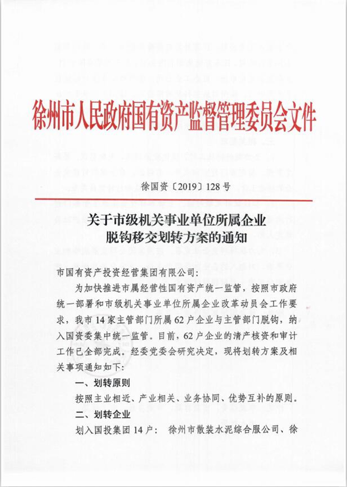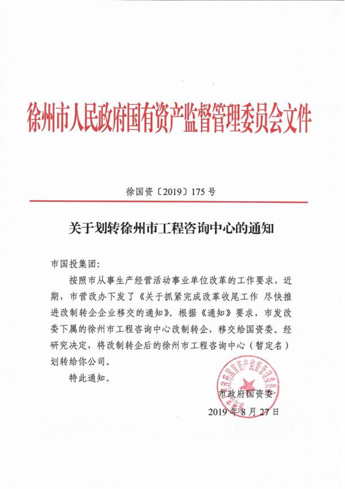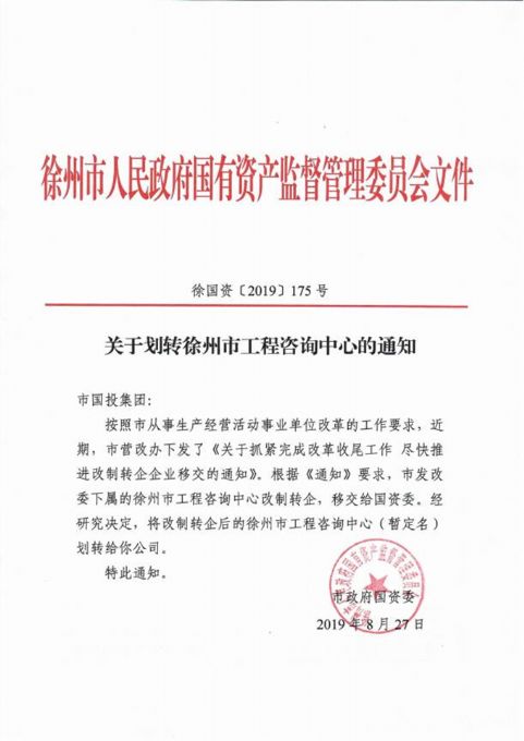 10.7月4日,市國(guó)資委印發(fā)《關(guān)于市級(jí)機(jī)關(guān)事業(yè)單位所屬企業(yè)脫鉤移交劃轉(zhuǎn)方案的通知》(徐國(guó)資〔2019〕128號(hào)),決定將徐州市商辦工業(yè)公司等14家企業(yè)劃入國(guó)投集團(tuán)。8月27日,市國(guó)資委印發(fā)《關(guān)于劃轉(zhuǎn)徐州市工程咨詢中心的通知》(徐國(guó)資〔2019〕175號(hào)),決定將改制轉(zhuǎn)企后的徐州市工程咨詢中心(暫定名)劃轉(zhuǎn)給國(guó)投集團(tuán)。