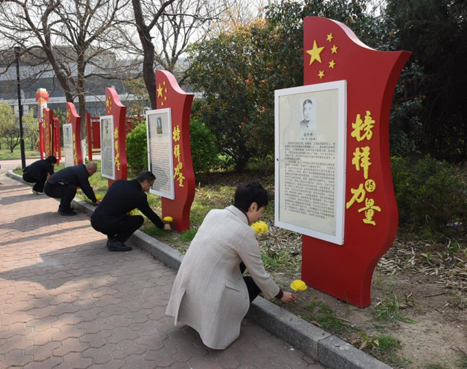 4月3日上午9時(shí)許,全體參與人員在會(huì)議室集中,利用彩紙、鐵絲等簡(jiǎn)單的材料親自動(dòng)手制作絹花,只見(jiàn)大家有的折紙、有的剪裁,寧?kù)o而肅穆的制作,表達(dá)著我們對(duì)英雄發(fā)自肺腑的哀思和敬意。制作完成后,大家來(lái)到黨建文化園《榜樣的力量》專(zhuān)題區(qū),手捧花束依次排開(kāi),向革命先輩深深鞠躬并默哀,將親手制作的絹花整齊擺放在展板前。隨后,機(jī)關(guān)支部黨員代表就榜樣專(zhuān)題事跡向大家做了分享交流,感悟他們?yōu)榱斯伯a(chǎn)主義信仰英勇獻(xiàn)身的光輝事跡。最后,大家來(lái)到黨建園的宣誓區(qū),舉起右手,莊嚴(yán)宣誓,重溫入黨誓詞、重悟入黨初心?;顒?dòng)結(jié)束后,大家紛紛駐足在園區(qū)的不同專(zhuān)欄,認(rèn)真瀏覽、細(xì)細(xì)品讀,久久不舍離去。